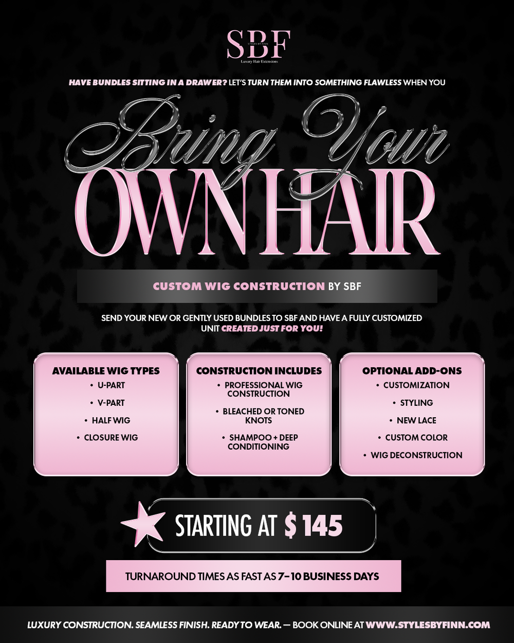 •When requesting custom color on extensions provided by another supplier, understand it is a REQUEST . A strand test will be done on all extensions provided. During a strand test we will take a small section of hair from the back of your wig or bundles and attempt to bleach / color it . This is done to ensure that the hair can handle the coloring process and remain healthy . If it is found that the hair can not take the processes needed to achieve your desired color , the service will be refused . To avoid this issue , allow Styles By Finn to provide you with top quality extensions.